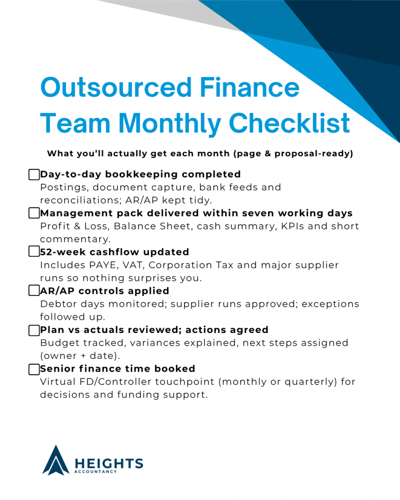 Comparing models? See Bookkeeper vs Accountant vs Finance Manager (UK) to pick what you keep in-house vs outsource.