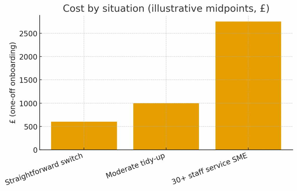 | Straightforward switch | Clean software, recent reconciliations, cooperative outgoing firm | £300–£800 |