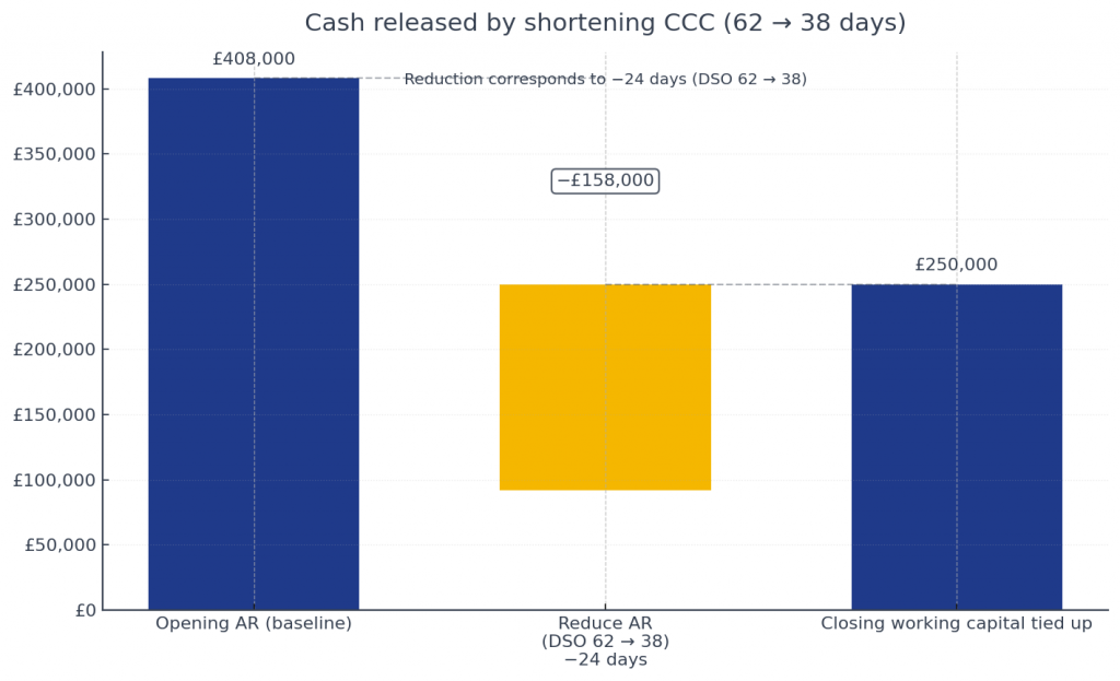 £ impact: Daily Sales ≈ £6,575. A 24-day CCC reduction releases ~£158k of cash (24 × £6,575) from your working capital.